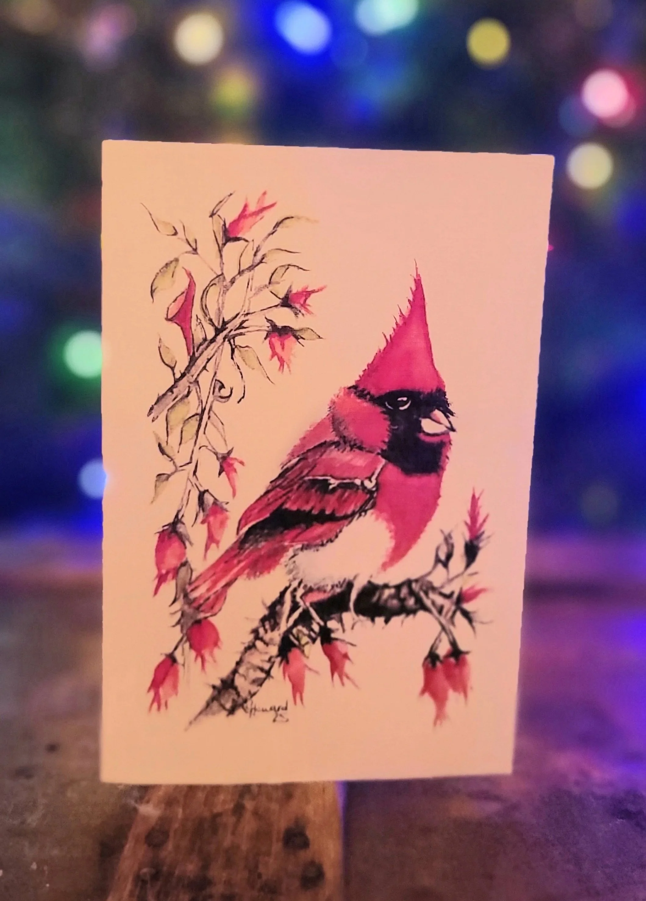 Hand-painted original design featuring elegant holly and vibrant red berries.